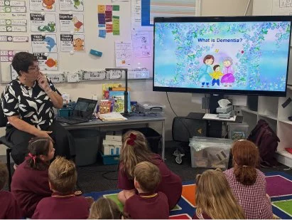Principal Corrina Hartland read the story to students, who responded thoughtfully — sharing ideas about what might be happening to Tom’s grandmother and how children can help older people who feel confused or forgetful. Several students even shared that they have grandparents living with dementia.